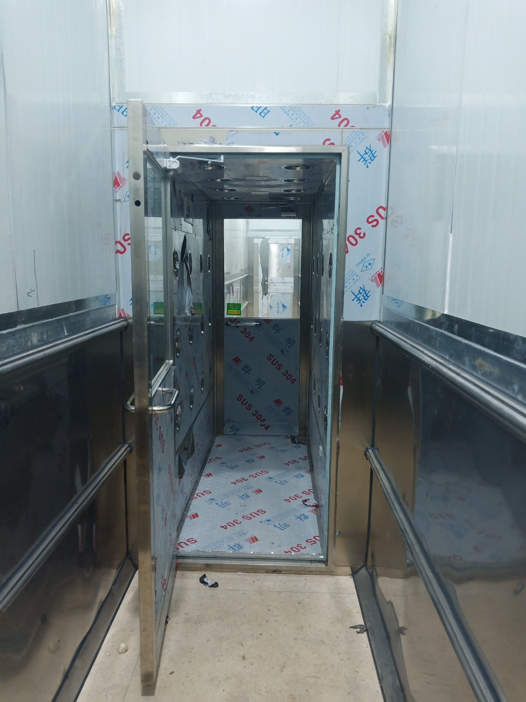 3、如果走廊位置比較緊湊,這種風(fēng)淋室在測(cè)量現(xiàn)場(chǎng)的時(shí)候尤其需要注意。尤其是鈑金型風(fēng)淋室,因?yàn)槌叽缫筝^高,我們?cè)跍y(cè)量的時(shí)候應(yīng)該多選幾個(gè)點(diǎn)進(jìn)行測(cè)量。前后測(cè)量,其次由于土建墻存在偏差,我們需要對(duì)土建墻的高低進(jìn)行測(cè)量。最后取最小值,以免風(fēng)淋尺寸過(guò)大而無(wú)法安裝進(jìn)去。