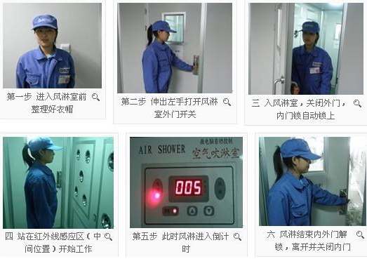 打開外門----內門上電鎖------進入風淋室-------關上外門(語音提示站在感應區內)內外門自鎖------ 紅外感應吹淋開始(語音提示吹淋過程)---------吹淋完畢(語音提示)-----進入潔凈室(內門自動解鎖)。